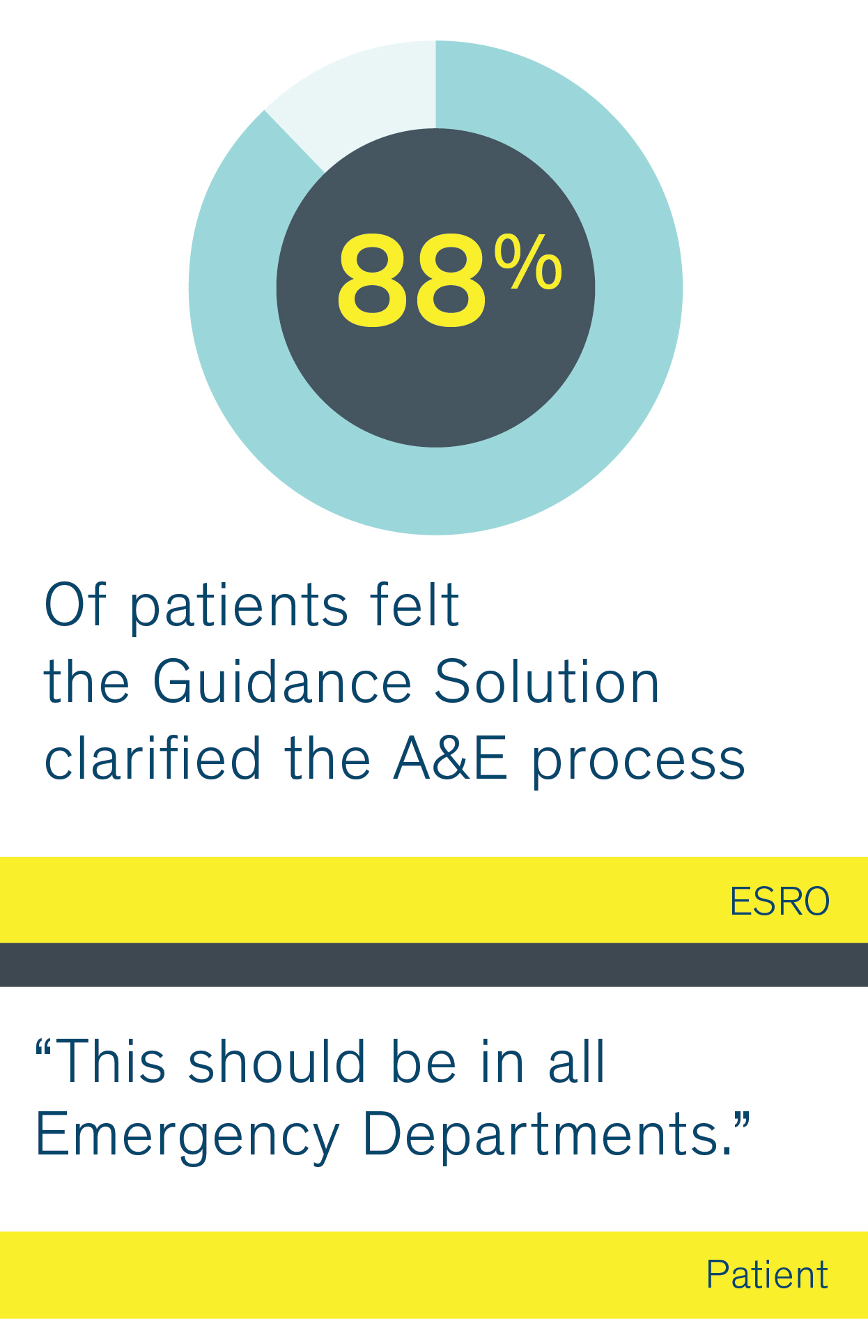 To understand whether the Guidance and People Solutions would successfully improve the patient experience and reduce tensions, they were installed and piloted at two A&E departments: Southampton General Hospital and at St George’s Hospital, London. Comparative control sites, with similar characteristics to the two pilot sites, were also selected for the respective pilot hospitals.