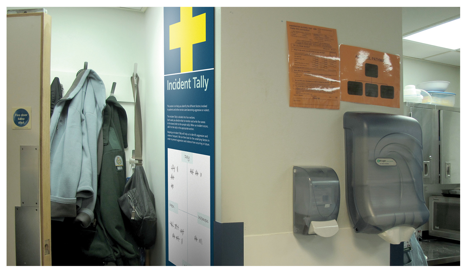 We offer a programme of design solutions that inform and guide patients through their time in the department, as well as working staff to support their interactions with frustrated and aggressive patients.